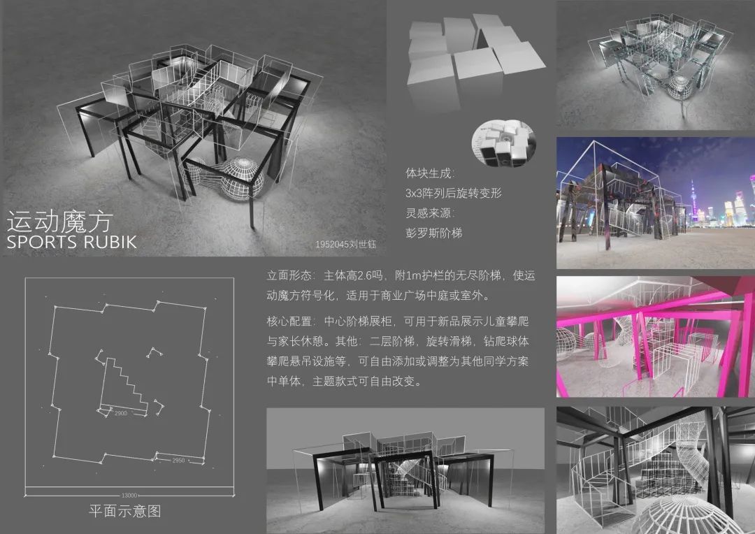 该设计采用体块生成的设计方法,使用3×3阵列并旋转变形,受彭罗斯阶梯的灵感启发,旨在传达“无尽的阶梯”、“无限地前进”之概念。其主体搞2.6m,外附护栏,将运动魔方符号化,适用于商业广场中庭或室外。