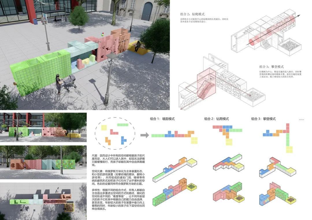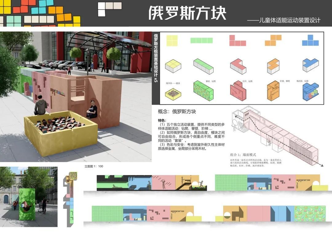 该设计以“俄罗斯方块”为设计灵感,采用五个独立活动装置,提供不同类型的多样体适能活动;如同俄罗斯方块的高自由度,各模块可自由组合,形成侧重点不同、难度不同的活动套装。在材料方面,考虑到室外耐久性,主体结构采用金属,坐、爬部分采用木材。在尺度上,所有空间依据孩子的尺度设计,成年人只能在其中缓慢前行,而孩子却能在其中自由奔跑。