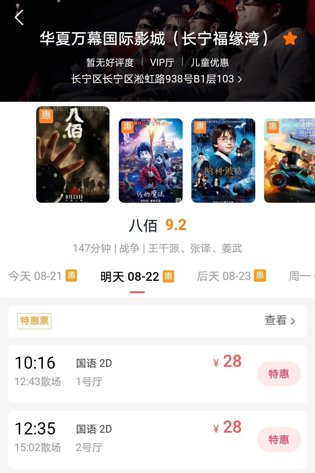 目前,影院排片包括了《八佰》《哈利波特与魔法石》《绝地战警:极速追击》和《1/2的魔法》,值得期待的是,9月30日、10月1日,《姜子牙》和《夺冠》也将在此上映。