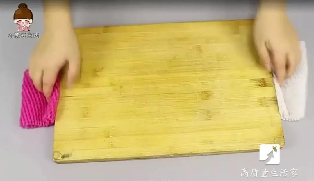 将两个水果网套分别垫在砧板的两端,这样就可以增大它的摩擦力,砧板就不容易来回移动了。