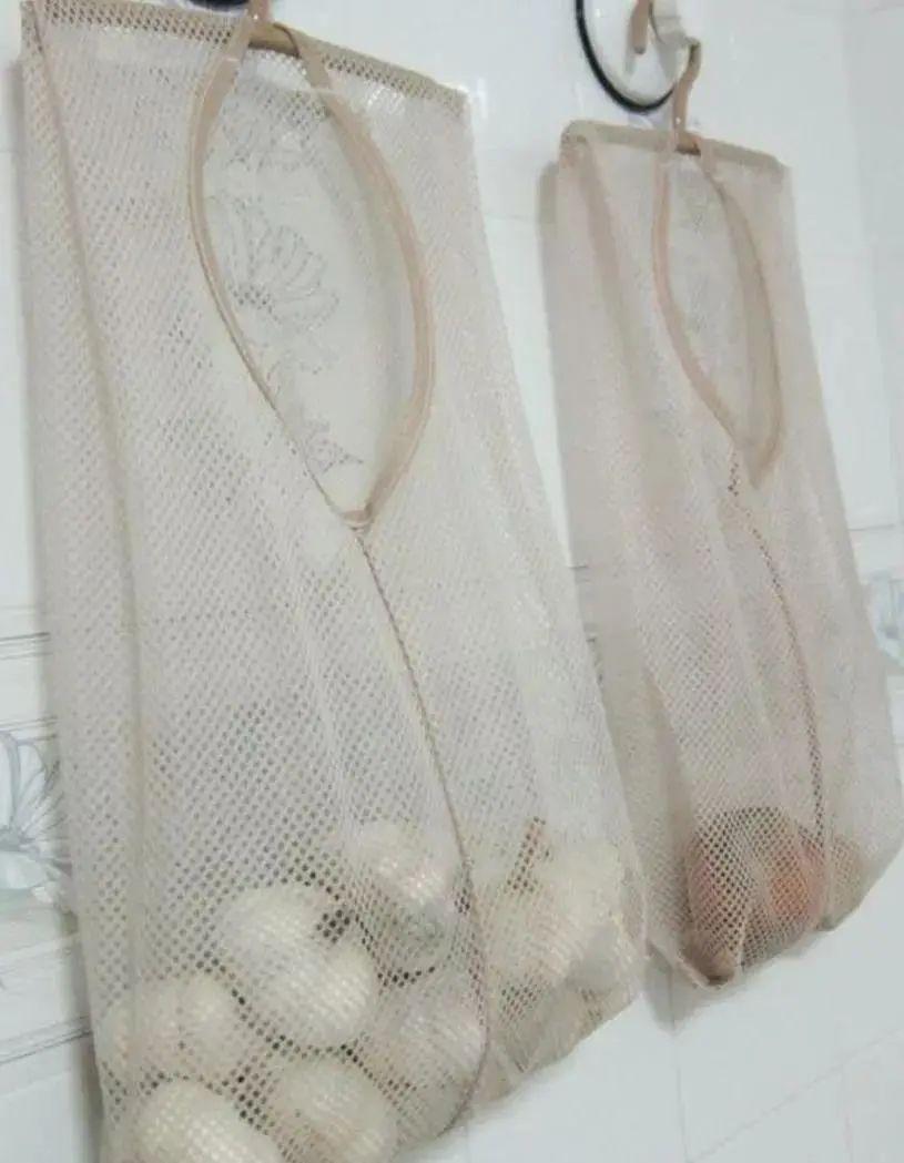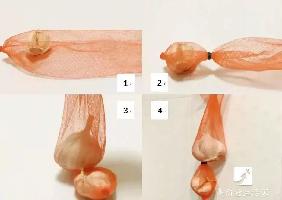 只需大蒜放入鸡蛋网套中,打个结后再放入另一个大蒜。