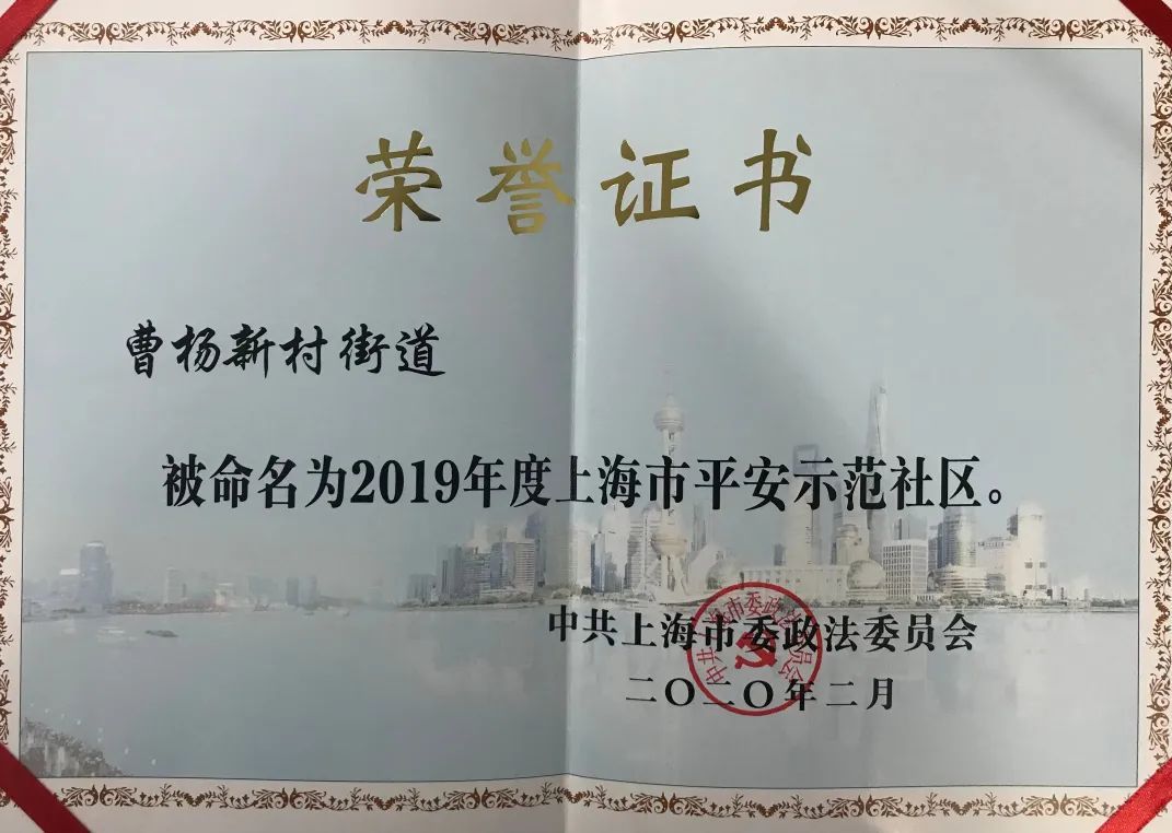 今年2月,曹杨新村街道荣获市政法委授予的“2019年度上海市平安示范社区”光荣称号!