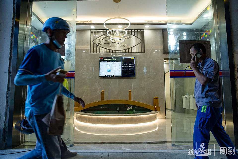 旧校场路,豫园商城4号门旁,蓝色的公厕示意牌高高挂在弄口。玻璃门内,施工人员正做着最后的整理工作。走进自动感应的玻璃大门,门厅里光线不错。正对眼前的,就是那有桥有莲的半圆形景观鱼池。粗粗一数,池中锦鲤约有几十条,一位工人正在对鱼进行养护。池中一角,小小的霓虹灯变幻着颜色。