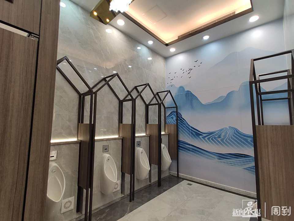乘公厕尚在装修、无人使用,记者将男女厕所都探访了一遍。男厕与第三卫生间分布于同一片区域的左右两侧,中间有安装了洗手台、衣冠镜的走廊隔开,墙上铺着带简洁纹理的六角形瓷砖。