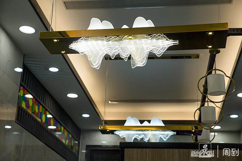 走廊左边的男厕,小便池用中式复古架子分隔,往里是蹲便间和坐便间。便间上方悬着一盏盏小巧的四叶草圆柱灯,带着些微宫廷风。