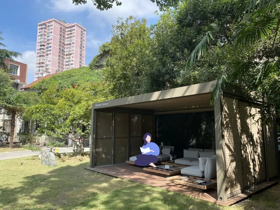 展馆后面的小天地:采用了具有传统日式风格的庭院装饰,虽然是很小的一块后院空间,通过光与影的绝妙平衡,使阴沉昏暗的空间有了流光疏影