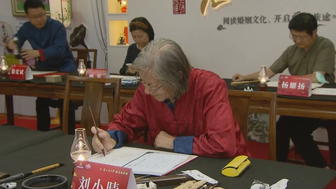 活动现场,书法大家刘小晴、戴小京领衔另外三位书法家杨耀扬、顾琴、徐宏斌的老中青三代书法家为徐汇区10对抗疫英雄、劳动模范、军人等楷模夫妻现场书写结婚纪念证书。吕晓慧、朱伟红等领导上台为十对夫妻颁发了结婚纪念证书并合影留念。