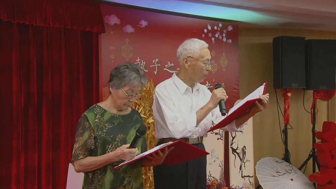 活动伊始,一对金婚老人为大家献诗一首,希望大家都能够与相爱的另一半执子之手与子偕老。随后,吕晓慧与朱伟红共同上台,揭开由上海市书法家协会主席丁申阳所题的“囍”字与对联,为本次活动揭幕。此外,还举行了徐汇区新时代文明实践基地揭牌仪式。