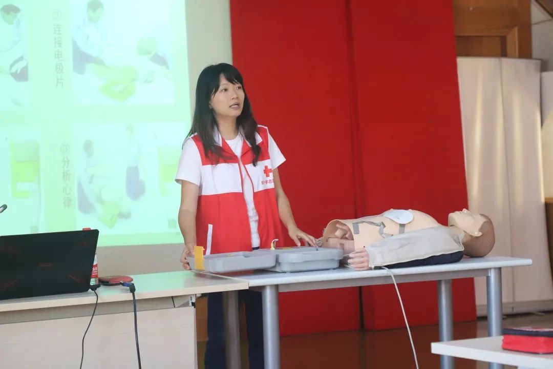 培训分为理论与实操两部分,有请到了黄浦区卫校的陈老师和柯老师为大家讲解心肺复苏术、AED机(心脏体外自动除颤仪)使用、创伤救护(止血、包扎、固定、搬运),以及常见急症、意外伤害等突发事件的处置要领。大家边学边练,彼此“切磋”。