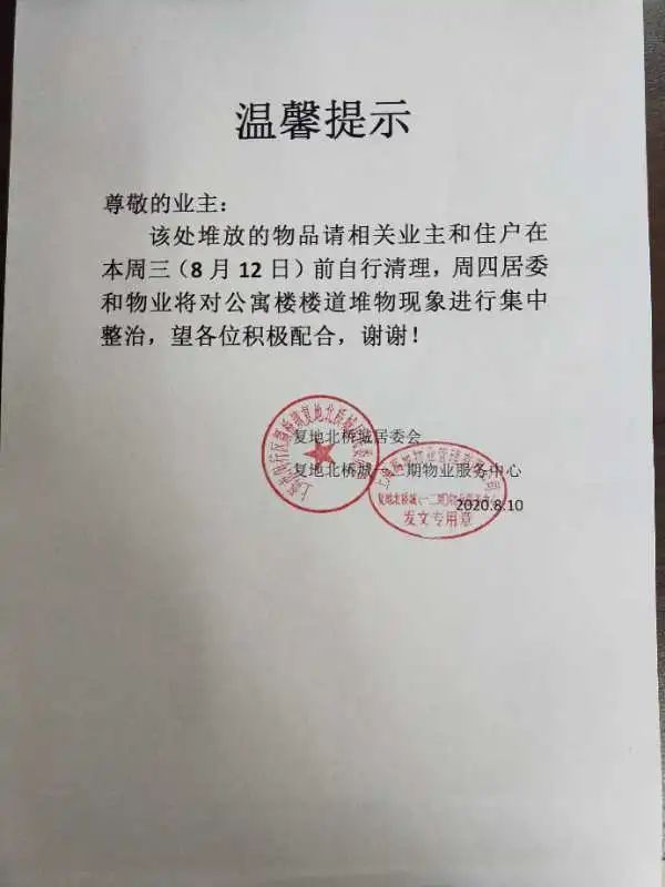 她说,居委会从8月10日开始对复地北桥城公寓楼楼道堆物、公共卫生、飞线充电等现象进行了摸排,在摸排的过程中也通过敲门告知和楼道内张贴告知书等两种方式向居民告知即将开展的整治行动,其告知中也标明了“请居民在规定时间内处置好楼道内的堆物,否则将按无主处理”的内容。