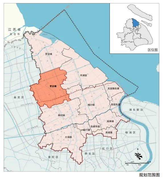 罗店镇隶属于上海市宝山区,位于宝山区西北部,南与顾村镇为邻,东与宝钢、月浦相依,西与嘉定区相连,北与宝山工业园区、罗泾镇相接。此次规划范围为罗店镇域石太路以南区域,用地面积40.43平方公里,此次规划期限为2019年~2035年,其中近期为2019-2025年;远期为2025-2035年。