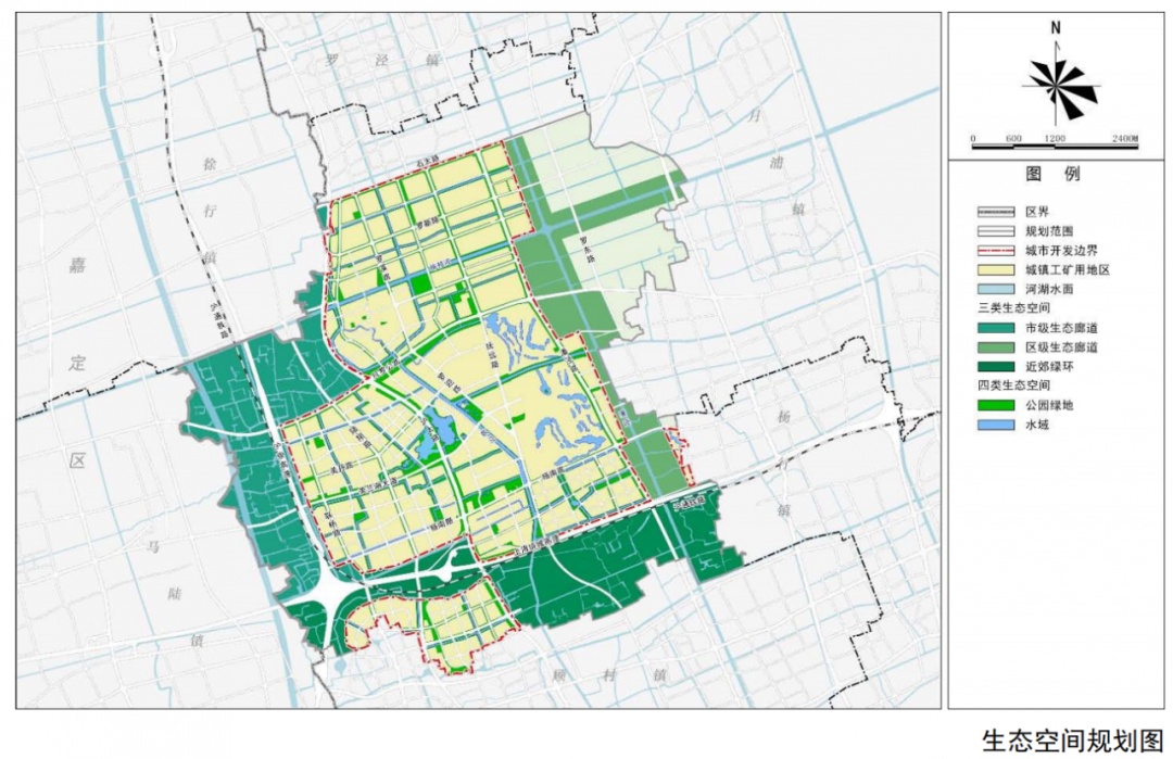 生态空间上,罗店镇域内共划定生态空间总规模约1825.75公顷,约占镇域总面积的45.16%,其中,城市开发边界外1328.61公顷,城市开发边界内497.14公顷。