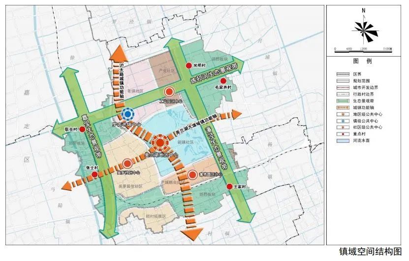 “两轴”是指沪太路城镇功能发展轴、美兰湖大道城镇功能发展轴;“三带”为练祁河生态景观带、嘉宝生态景观带、潘泾生态景观带;“一主”是美兰湖综合服务中心;“四辅”为罗店老镇综合服务中心、美罗社区生活服务中心、富锦园区生产服务中心、工业园区配套服务中心;“多节点”则为张士村、联合村、光明村、王家村和毛家弄村等村庄。