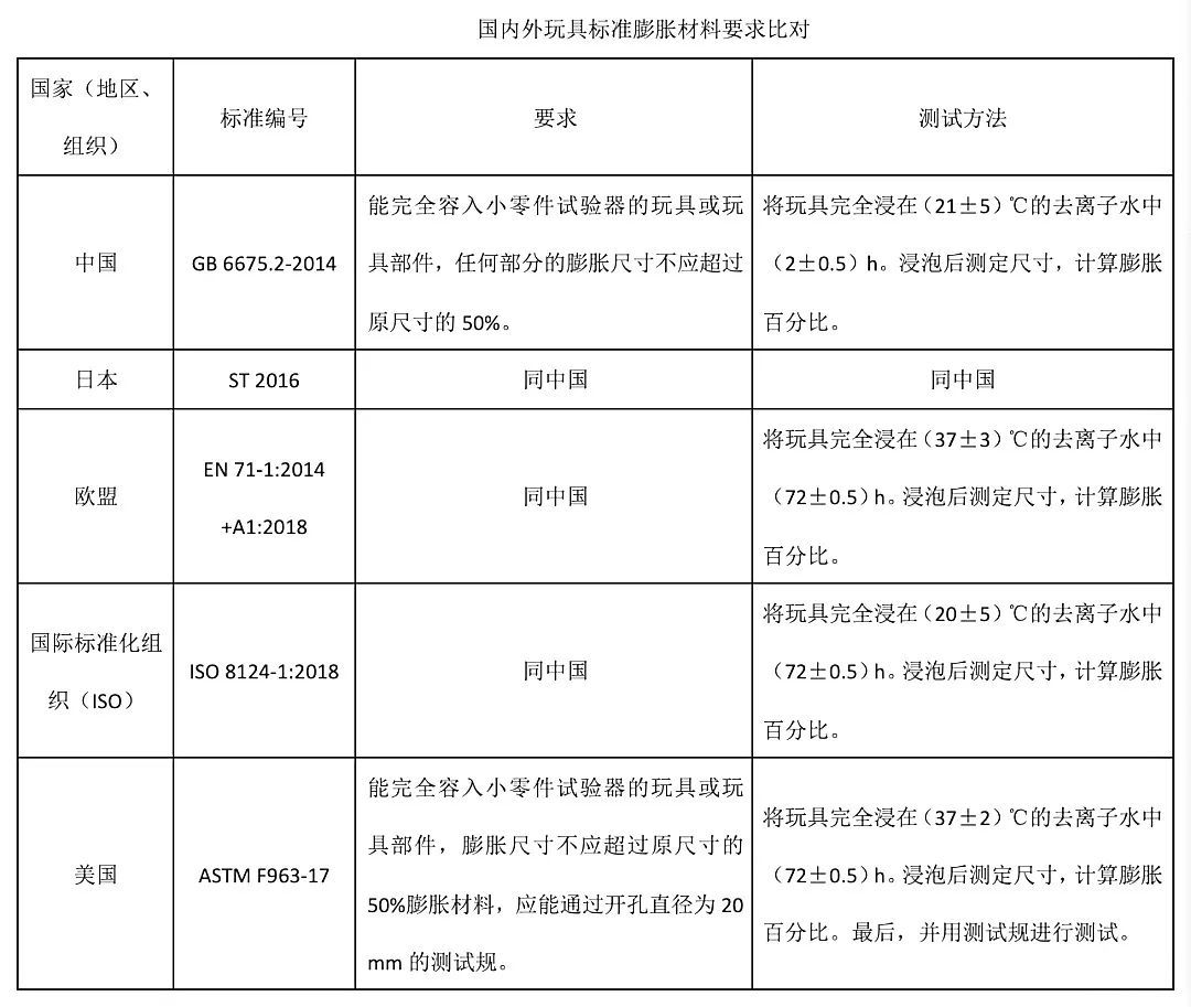 根据玩具安全国家标准GB 6675.2-2014的要求,膨胀材料经过测试后,任何部分的膨胀尺寸不应超过原尺寸的50%。欧盟玩具协调标准EN 71-1:2014 +A1:2018、ISO玩具标准ISO 8124-1:2018中关于膨胀材料的要求与国标要求一致,但测试方法比国标更加苛刻。美国玩具安全标准ASTM F963-17的要求略有不同,经测试后膨胀尺寸超过50%的属于膨胀材料,但能通过直径为20 mm的测试规定的判定为合格。日本玩具标准ST 2016的要求和测试方法与国标一致。国内外主要国家和地区玩具标准关于膨胀材料的要求及测试方法对比如下表: