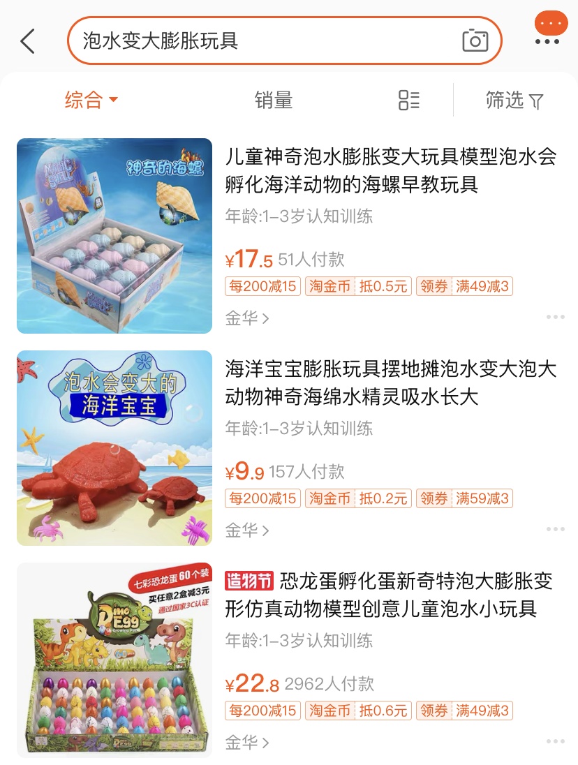 在电商购物平台输入膨胀玩具能找到非常多的玩具产品,其中较多的品类包括吸水膨胀水养动物模型、恐龙孵化蛋玩具、水精灵水晶球、水养植物模型等。有的甚至标注着醒目的“特大”“超大”“巨型”“巨无霸”等字样,而且这类玩具通常价格很低,十几元可以买一大把,隐患很大。家长们需要擦亮眼睛,谨慎购买。