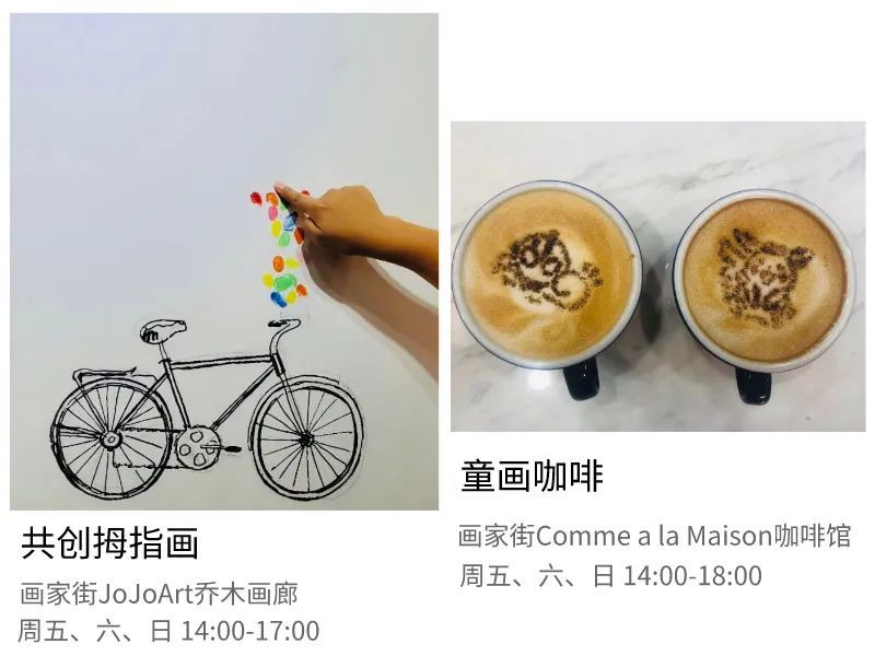 举办联展期间的每周五、六、日,画家街JoJoArt乔木画廊与Comme a la Maisom 咖啡馆将推出“共创拇指画”“童画咖啡”活动,具体参与方式请至店咨询店员。