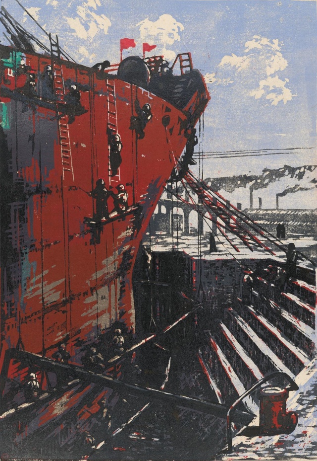 作品刻画了船坞中的工作场景。画面中的工人正站在梯子或木板上为大船涂着红色的油漆。低角度的仰视凸显主体的高大,整块大红色在蓝天的映衬下显得格外醒目,并营造出船坞里工人们热火朝天的劳动气氛。红色和蓝色的对比,产生强烈的视觉效果。20世纪50、60年代,沈柔坚创作了一大批表现工业建设场面的作品,色彩运用大胆,构图独特,突出艺术语言的表现力。运刀有力,潇洒随意,尽显大刀阔斧之态。新时期的沈柔坚对版画艺术有了进一步的探索,尤其是对色彩运用的关注,形成新的艺术风格,此作便是这一时期的代表作之一。