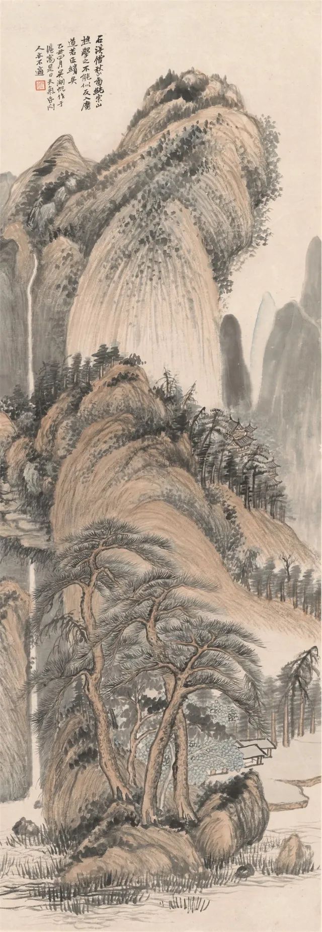 此画营造出了一种“可游、可居”的境象氛围,令观赏品玩者不禁产生“云游居住”之遐想。作品画面留有空白作虚的处理,形成意境开阔、气象清新的艺术境界。画面构图布局,缜丽丰腴,意境空灵;用笔着墨滋润秀雅,富有情趣;设色清丽而秀润。画中山石层峦斜倚,并以披麻皴法勾勒石质,远山则以淡色薄薄带出,一派仙山之姿色。