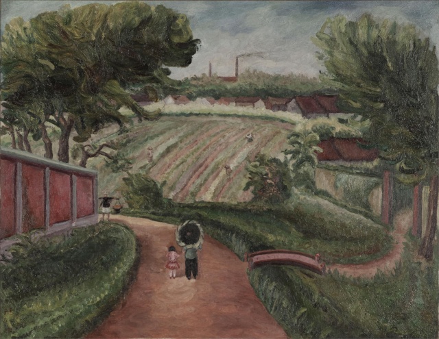 此作应为陈澄波旅沪后期的作品,以浓稠却又细致的笔法,描绘一个类似舞台布置的场景。近景是一对持伞携手的母女(或是祖孙),走在向后蜿蜒的黄泥土路,拐角处有较明亮的阳光,一位挑担的男子,正在向前走来;黄泥土路的右边,是一条小溪,有一座小弯桥,越溪连通另一小路,通往右方围墙内的庭院。正前方是一片带着坡度的菜园,园中有两三位载着斗笠、正在工作的农夫;越过菜园,隔着村落,更远方是正冒着白烟的工厂,被左、右两侧近景的大树丛烘托着,天空是由深而浅的蓝色。全幅充满了空间层次的变化与红、绿色调的参杂并存,洋溢着一种安和乐利、舒缓愉悦的田园情趣,质朴而真挚。