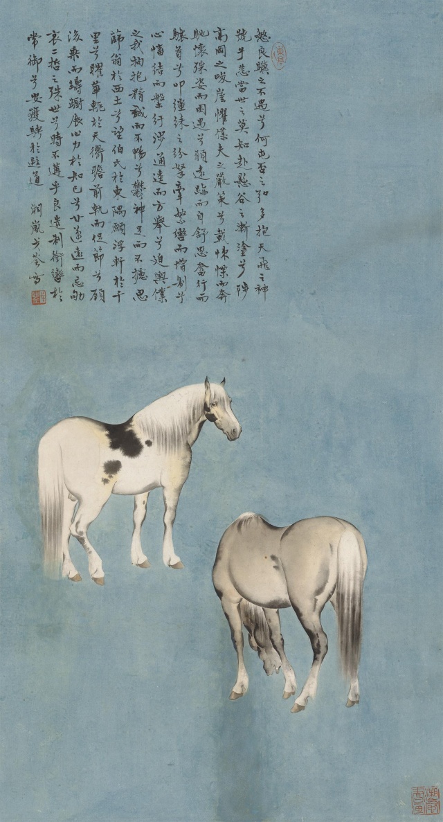 此幅《马》是戈湘岚1940年创作的马系列之四。这一系列的马雅妍清逸,赋予他自身独特的人文精神。画面上不设背景、细节,仅有两匹闲庭信步的马错落描绘,以墨韵分染结构,浓墨晕染斑纹。以淡彩赋色,姿态悠然而自得。在表现技法上,勾勒精细,刚柔并济,设色雅致,虚实相生。