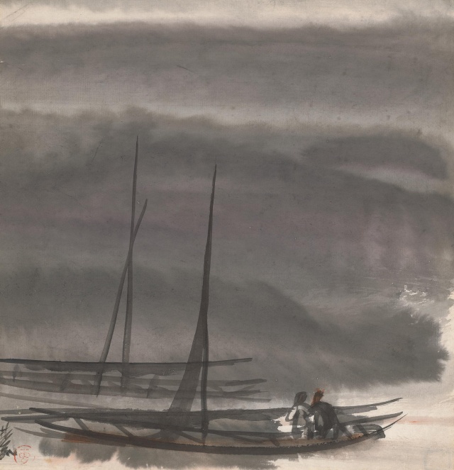 画面描绘了暮色苍茫之中,渔舟收帆停船的景象。画幅左下脚有林风眠的题款,印鉴为风。这幅画以淡黑横扫,将天空水际表现得云雾弥漫、空旷渺远,又以重墨简笔勾绘渔舟和人物。结构上采用方纸布阵,渔船直树的桅杆,与横向描绘的的云气、水面、船只相穿插,形成纵横交错的韵律。