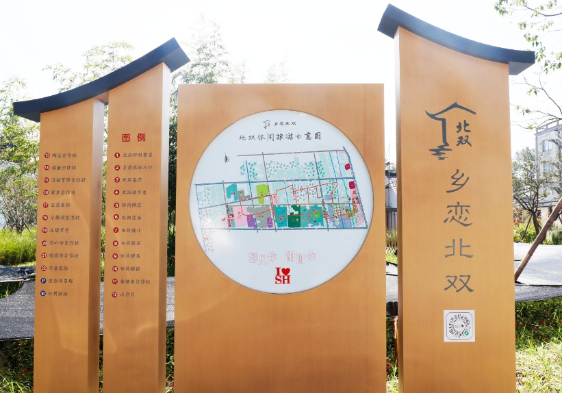 北双客厅:占地面积1200平方米,分前、后两庭。前庭功能涵盖游客接待、健康小屋、儿童乐园、特色农产品展示、游客休闲水吧等功能。还有建设中的桃园角、乡情馆等。后庭是老百姓集中办酒场所,为村民红白喜事、团餐接待提供便利。室外还设置了自行车驿站,游客可在此租赁自行车,通过自行车骑游方式开启北双之旅。