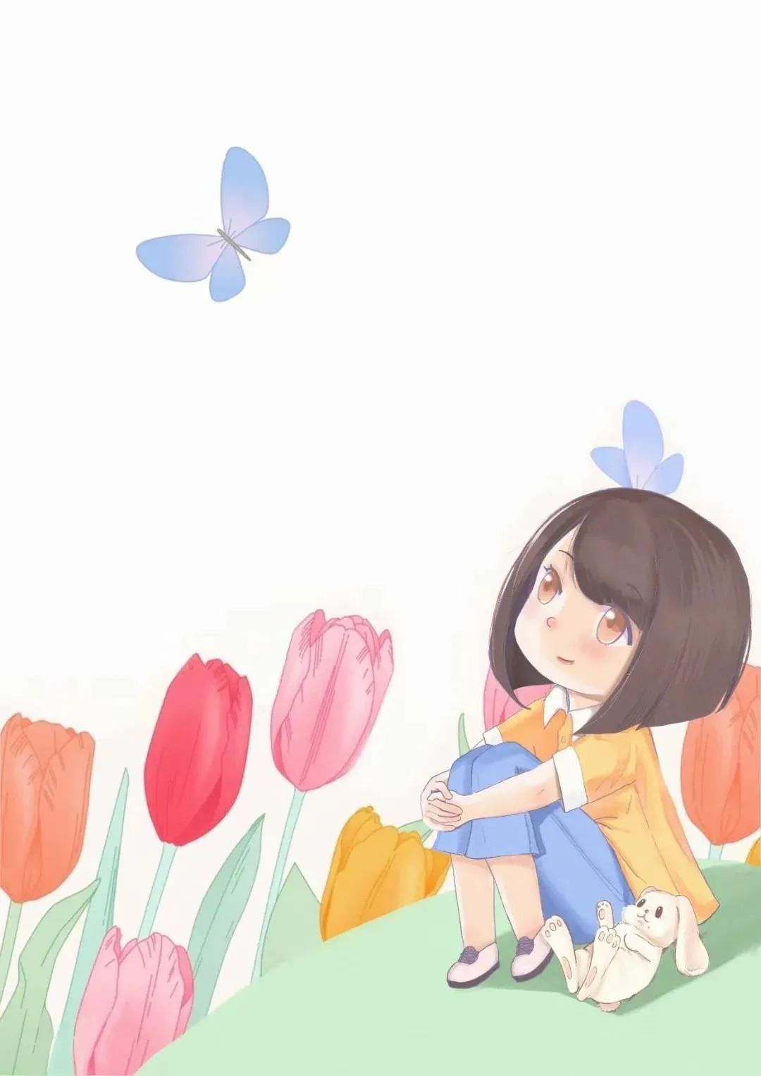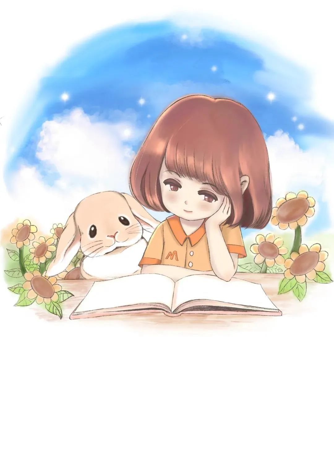 我想画一个乐观、天真、可爱的普通小孩,就像我们身边的孩子那样。我将一句句轻声细语,融入这些画中。给他们美好与想象,送他们一个童话世界。所以,就有了这个短发女孩和一只可爱小兔子的组合。