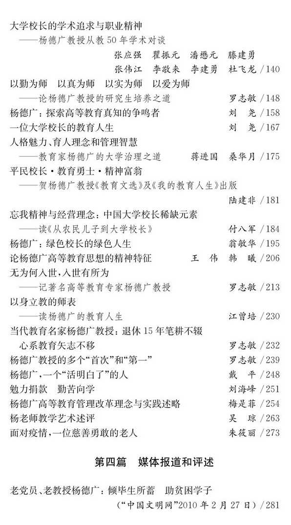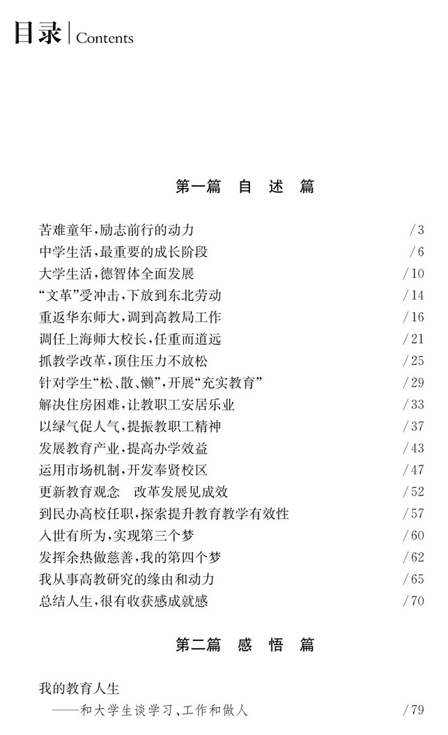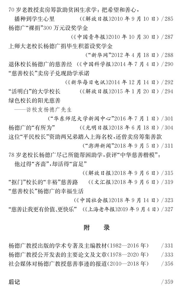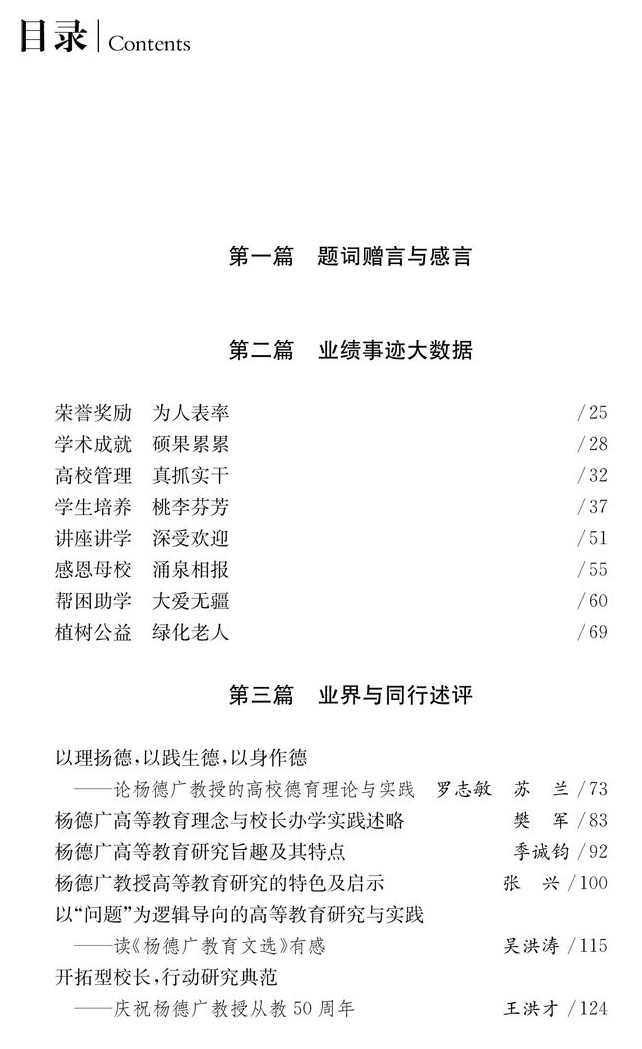 2020年,“中华慈善楷模”“从事高教工作逾30年、高教研究有重要贡献学者”“全国离退休干部先进个人”杨德广先生八十岁了,可他仍满腔热情地活跃在教学科研、慈善公益第一线,未显半丝倦意。他是在我国从计划经济向市场经济转轨转型过程中成长起来的一位大学校长,他敢想、敢说、敢做,先后在上海大学、上海师范大学主导过几次很成功的改革实践,被称为我国高教界的一位“闯将”。他勤俭清廉,心怀大爱,用自己的积蓄甚至卖掉房产帮扶贫困优秀学生。正如他听得最舒心的一句赞扬:“活明白了!”他的一生丰富多彩,《杨德广八十自述自选》《杨德广八十评述评论》从杨德广先生自己的视角,从专家学者、同仁、学生和新闻媒体等视角,多方位展现了杨德广先生从农民儿子、贫困学生到大学教授、大学校长,直至成为中国高教界泰山北斗,坎坷曲折的励志人生、耀眼夺目的辉煌功绩,很值得后人后学分享流传。