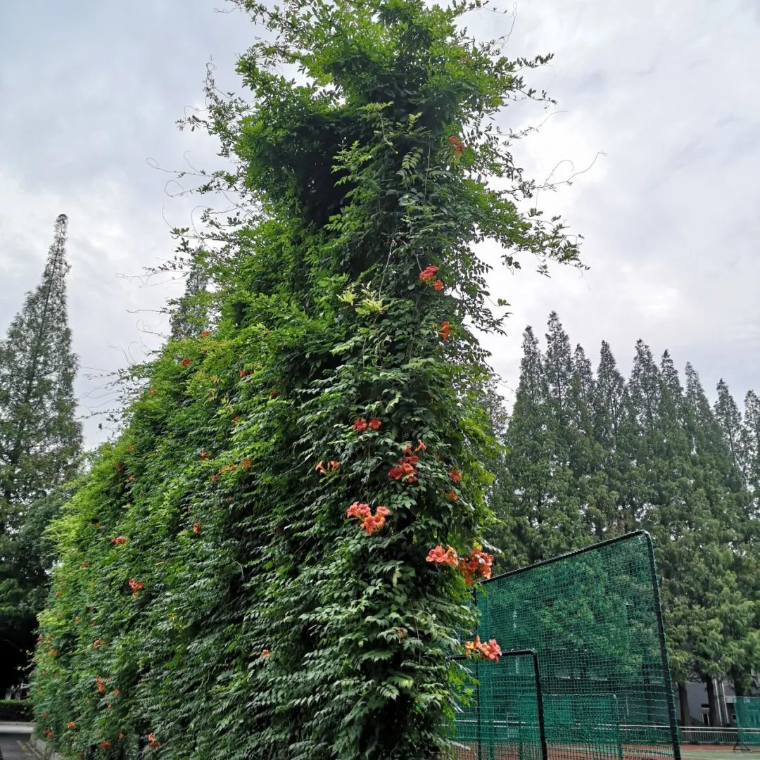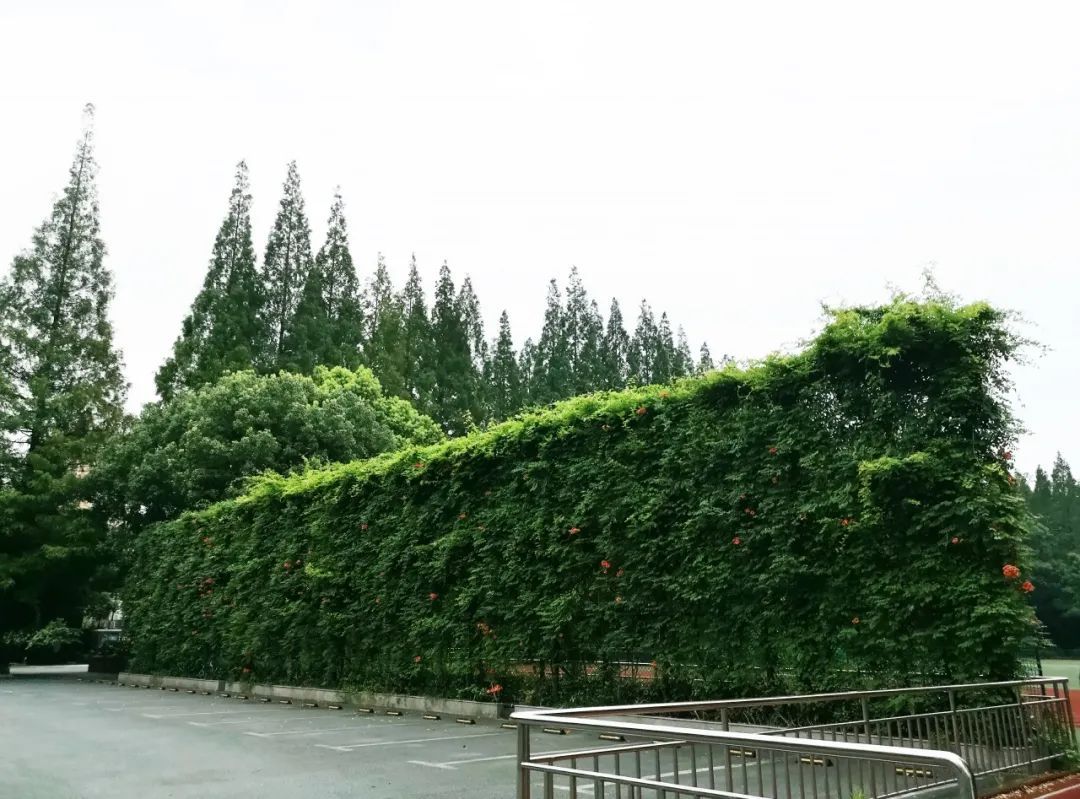 上海市南湖职业学校是花园式学校,绿地率达40%。在大力发展地面绿化的同时,学校积极探索立体绿化。目前,学校4个停车棚及操场与停车场之间的隔离栏布置了以紫藤、凌霄为主的“花墙”,面积超1000平方,不仅增加校园绿量、拓展校园绿化空间,更让设施的功能和绿化的生态效应有机融合在一起。