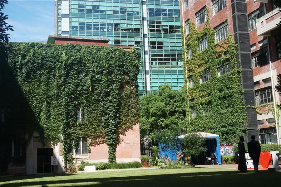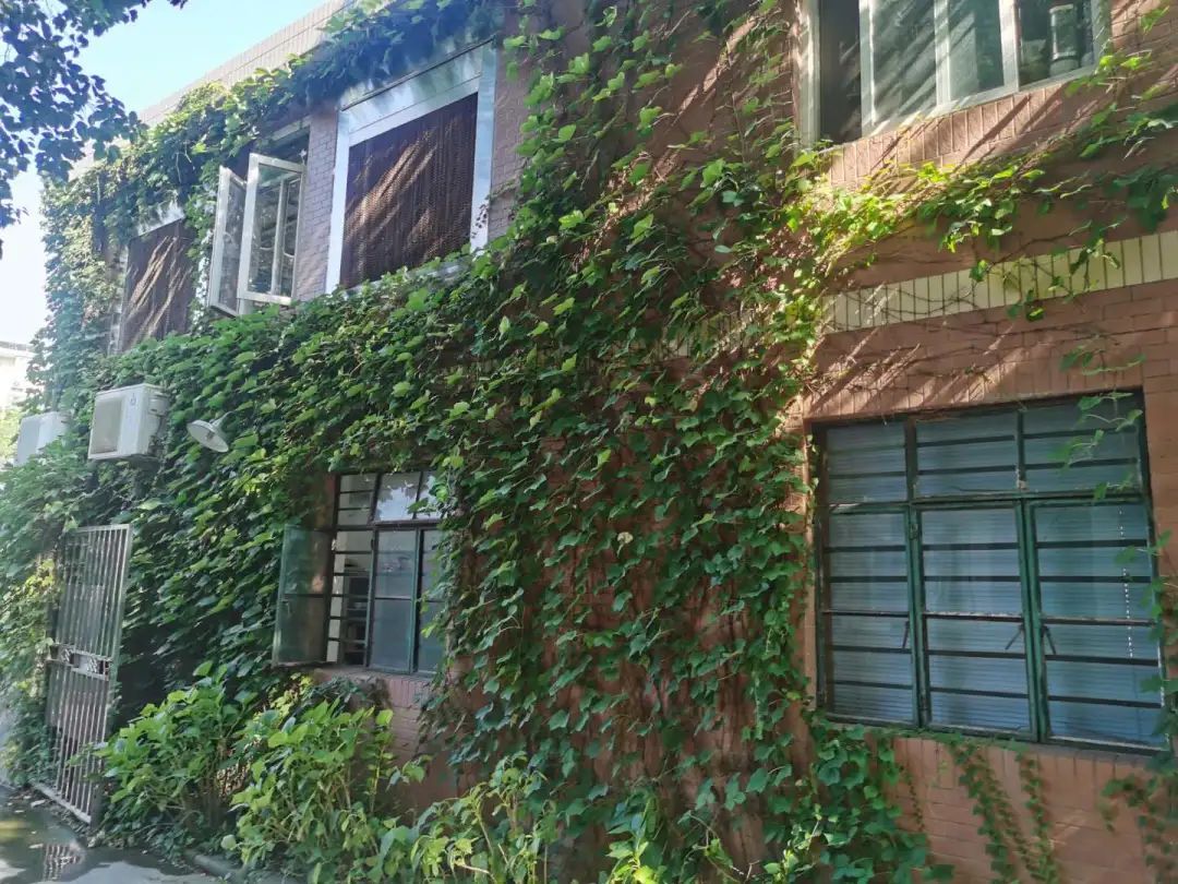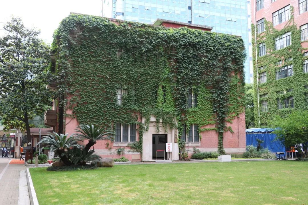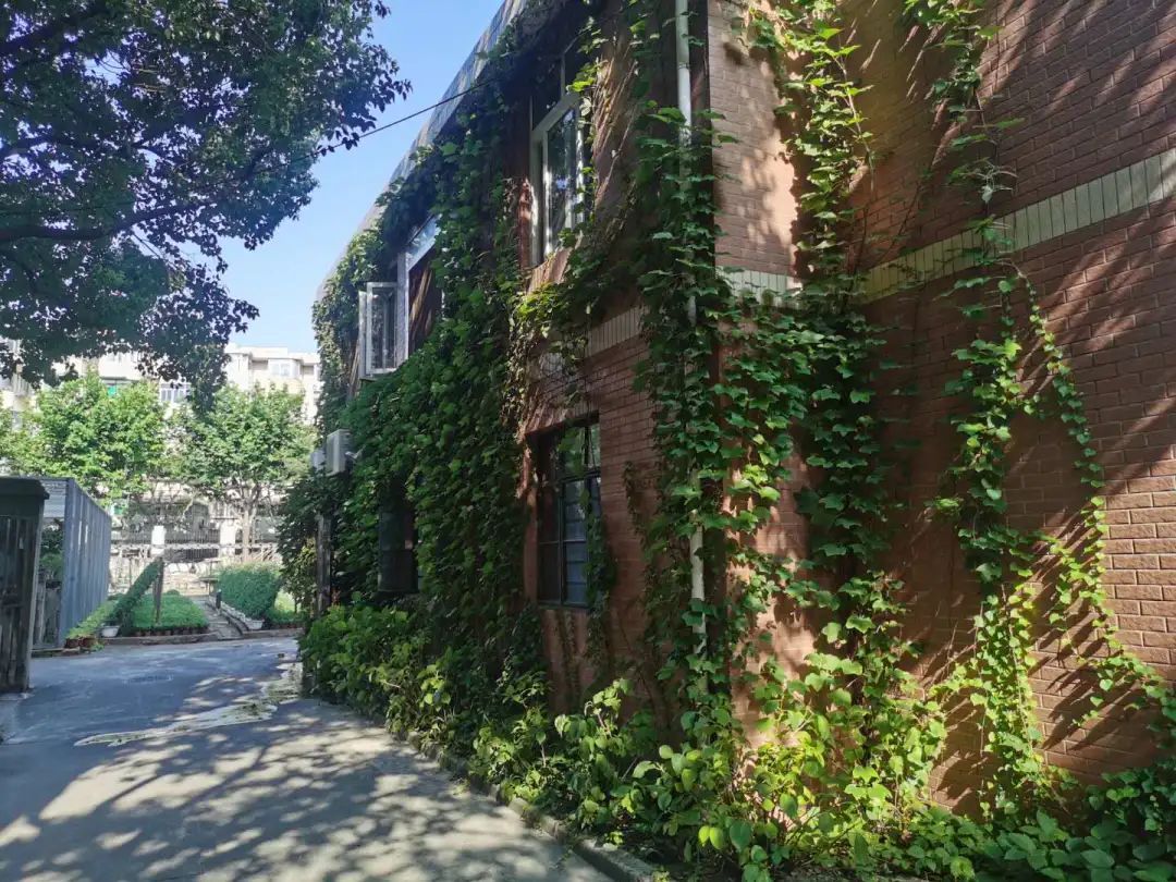 格致中学前身为“格致书院”,始建于1874年,迄今已有140余年历史。图上的两幢楼,一幢建于1921年,另一幢建于1996年,分别于2005年外立面大修时对爬山虎墙面绿化进行修剪提升。