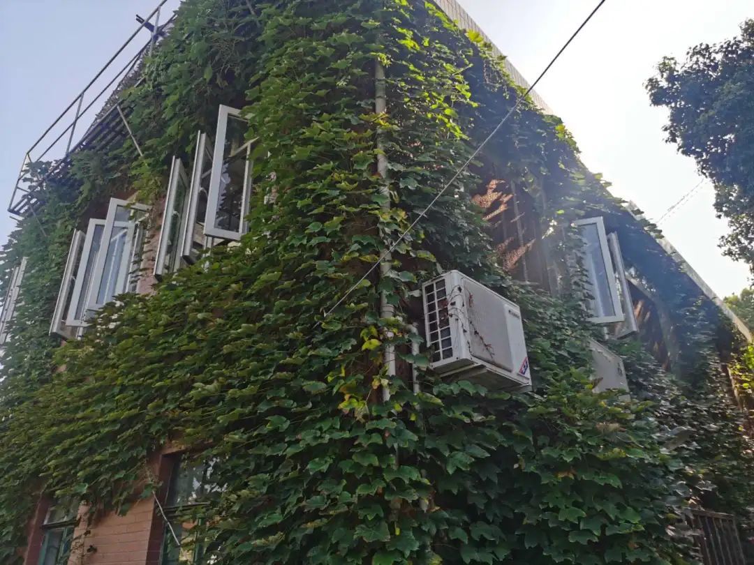上海市作家协会位于巨鹿路675号,单位绿地率达33.5%,院内绿树成荫,竹影摇曳,金黄的银杏,火红的红枫,粉嫩的樱花,秋天绕梁不散的桂花香组成了一年四季各不相同的景致,而包裹在建筑外的这身“绿衣”更是在每年夏季给办公人员带来了阵阵清凉。