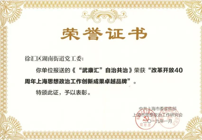 (《“武康汇”自治共治》荣誉证书)