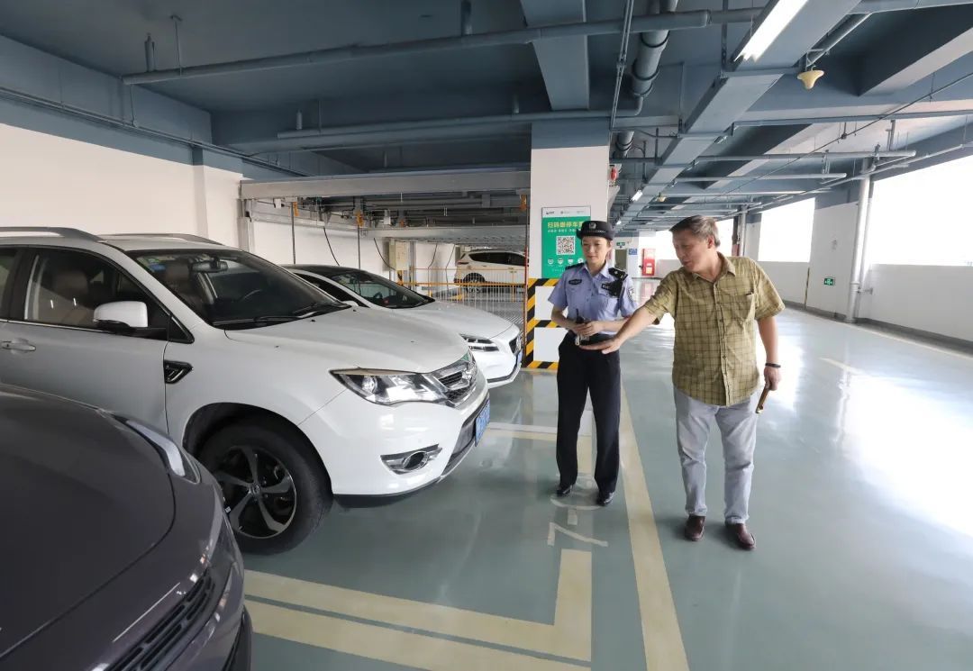 朱静怡与停车场负责人探讨周边居民错峰停车的问题。