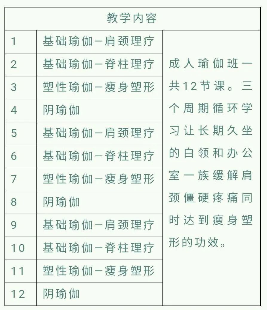 课程介绍:成人瑜伽班一共12节课。适宜人群:长期久坐的白领和办公室一族、不适宜剧烈运动的亚健康一族,肩颈僵硬疼痛的低头族,课业繁重的学生族。通过古印度瑜伽术中的特定体式练习,达到舒筋活血,按摩人体淋巴,排出毒素,灵活身体,瘦身塑形的功效。基础瑜伽课程选用的体式老少皆宜,不需要任何瑜伽基础,只要努力练习,做到自己最好的状态就能够达到强身健体,美化体型的理想效果。