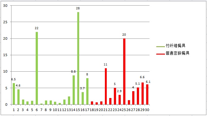 以4%乙酸环境下的数据为例,竹纤维餐具有害物质的迁移均量普遍比普通密胺餐具高,个别数据甚至超出1倍。