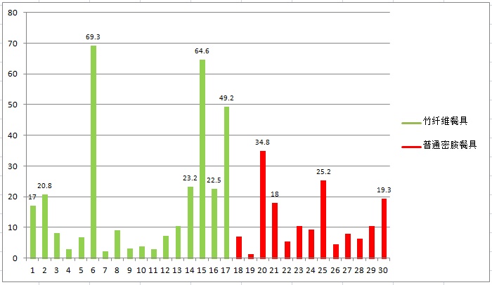 为了解竹纤维餐具与普通密胺餐具品质上的差异,上海市消保委对市场上销售的30件密胺类餐具进行了比较试验(线上16件,线下14件),包括了17件标称含竹纤维的餐具,13件普通密胺餐具,价格从7.9元至89元不等。