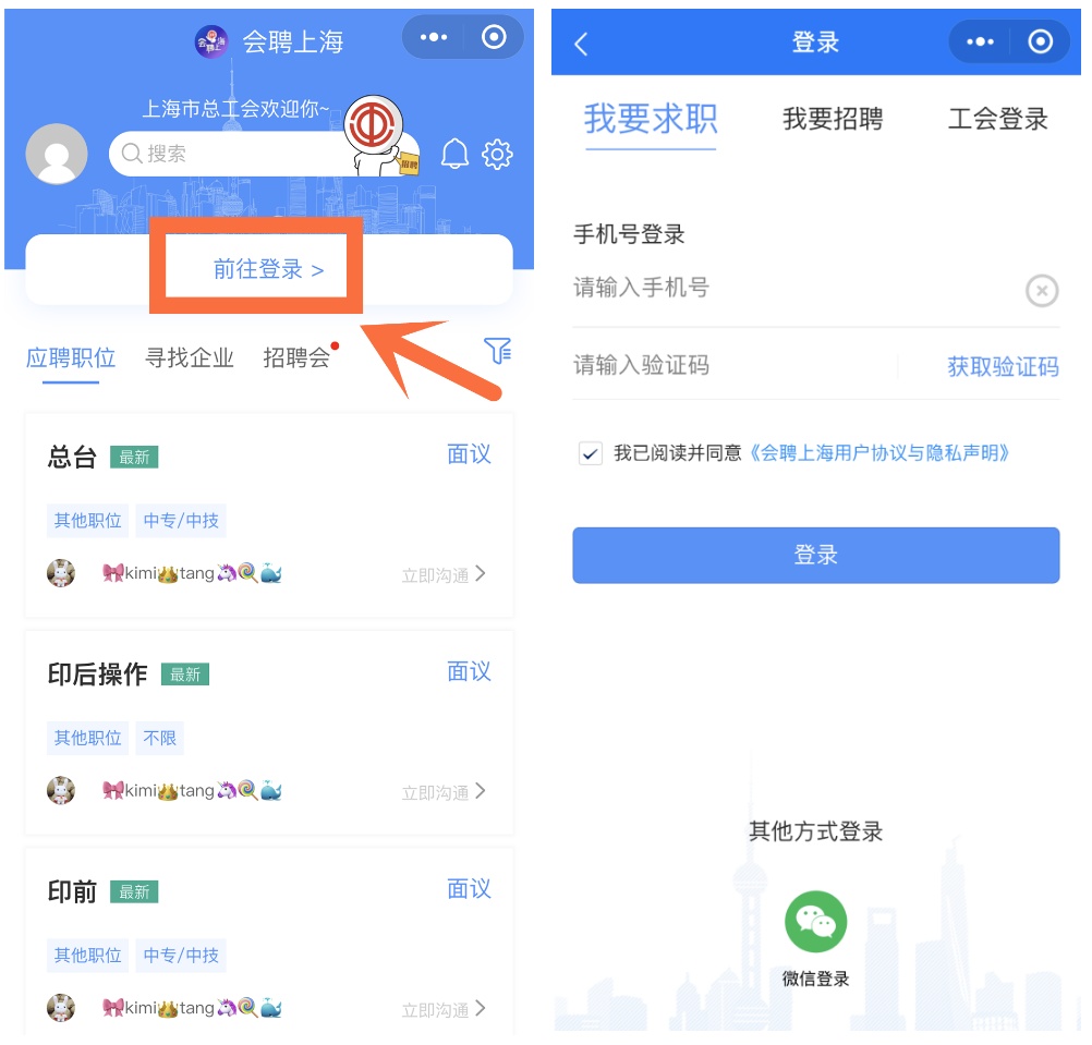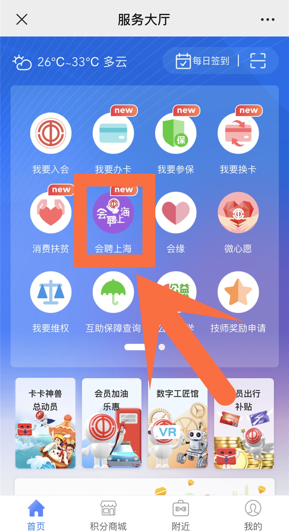 打开申工社微信的【服务大厅】,找到【会聘上海】点击进入