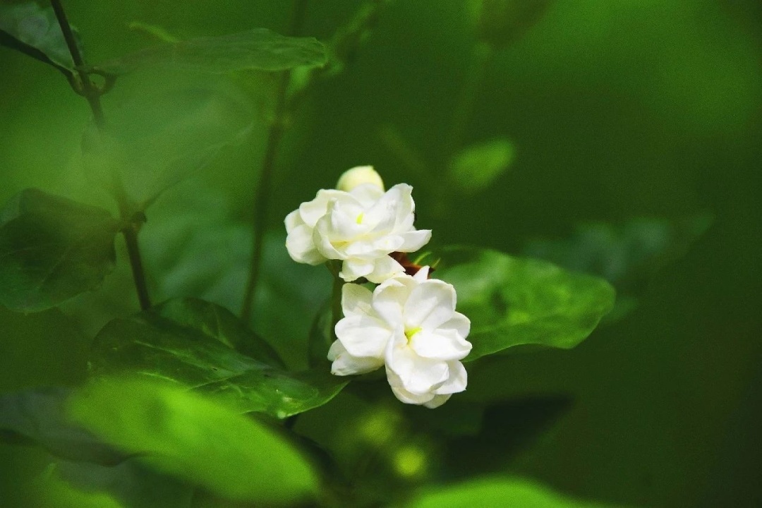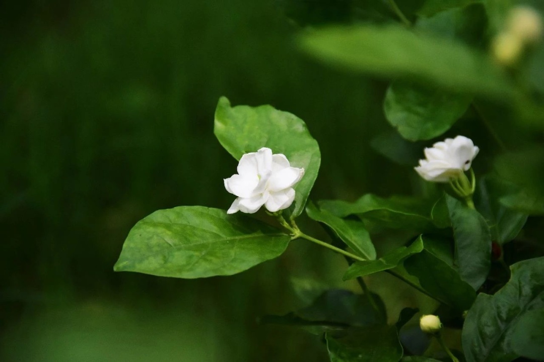 茉莉花是木犀科素馨属常绿小灌木,叶对生,单叶,叶片纸质;聚伞花序顶生,洁白的花儿娇小玲珑,清纯而淡雅。