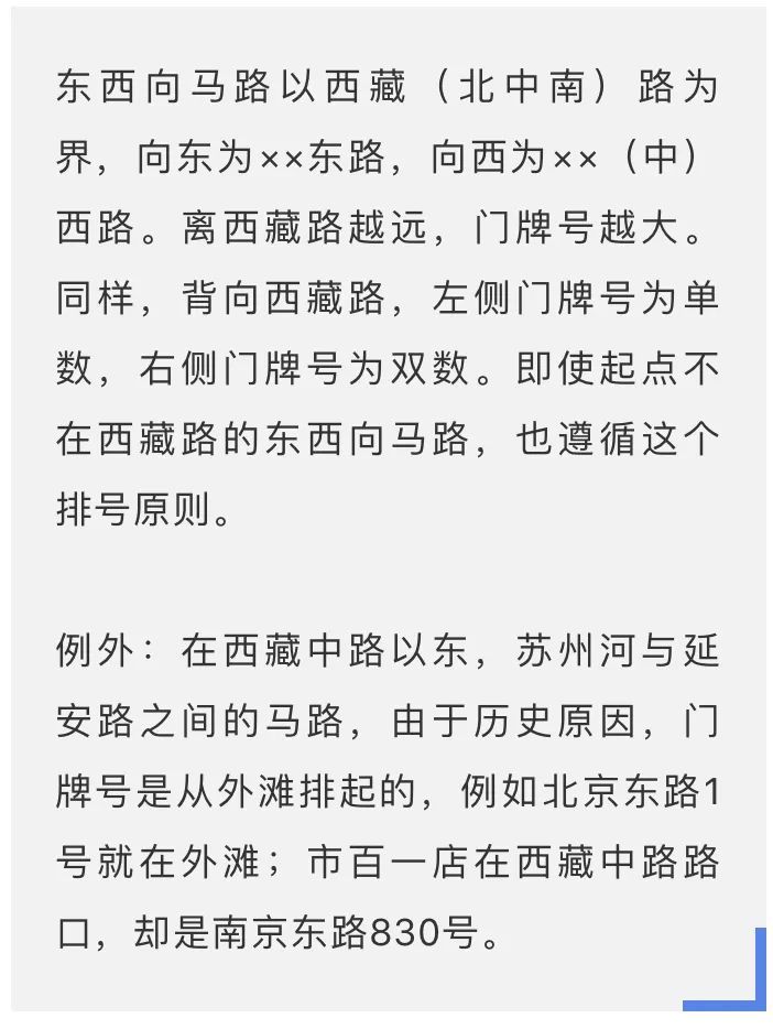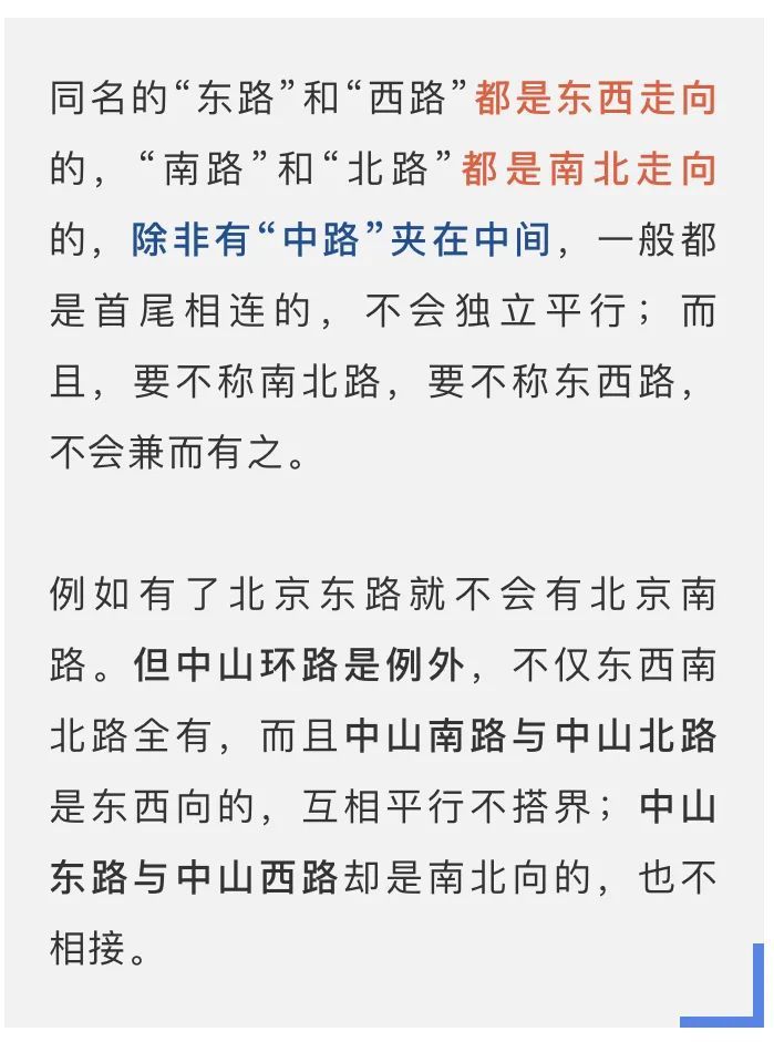 如果南北向马路跨越苏州河,那么延安路与苏州河之间的一段叫××中路,到苏州河北才叫××北路。但门牌号的排列规则不变。