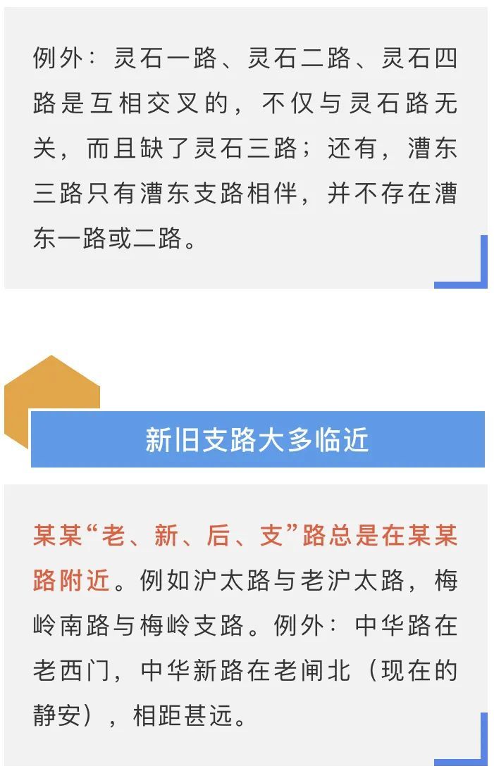 不少道路是以两端地名命名的。例如从龙华到吴泾的龙吴路、从曹家渡到杨家桥的曹杨路。但是由此派生的曹安路的“曹”是指曹杨路,不再是曹家渡了。
