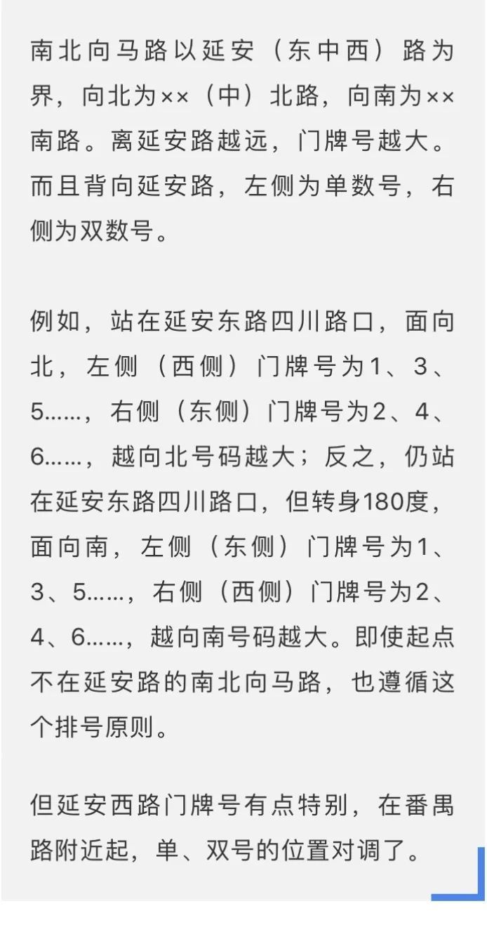 有的南北向马路以“一路”“二路”称呼,那么近延安路者叫××一路,离延安路远者叫××二路。如延安中路向南的“瑞金一路”“瑞金二路”;延安中路向北的“石门一路”“石门二路”。但门牌号的排列规则不变。