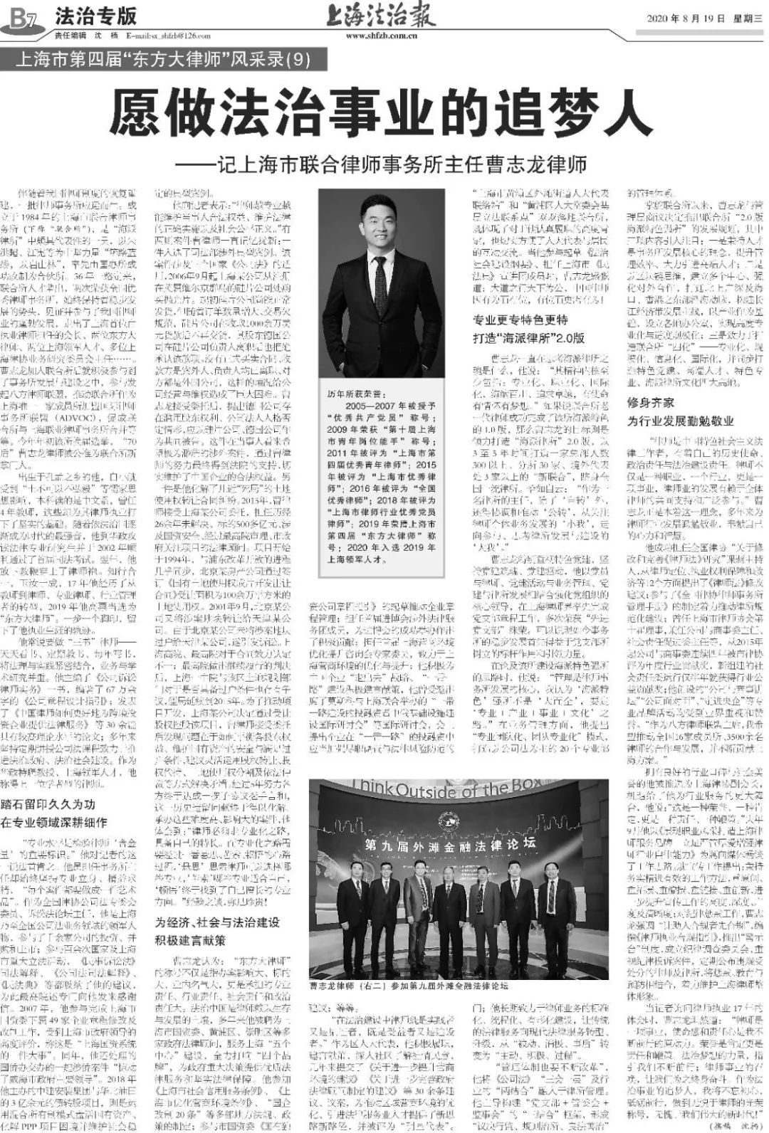 “上海市黄浦区外滩街道人大代表联络站”和“黄浦区人大常委会基层立法联系点”双双落地联合所,既体现了对于他认真履职的高度肯定,也切实方便了人大代表与居民的互动交流。当他参与起草《法治社会建设纲要》、担任上海市《民法典》宣讲团成员时,曹志龙感慨道:大道之行天下为公,中国律师因有为而有位,有位而更需有为!