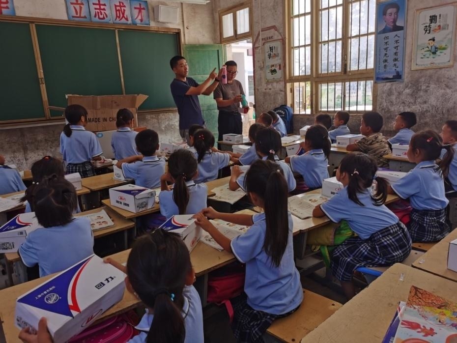 支教民警魏晓虎教小学生们用保温杯,避免烫伤