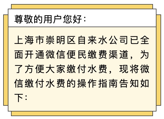 提示:崇明区自来水公司已全面开通微信、支付宝水费支付功能,供水区域内所有用户可自行选择进行操作付费。