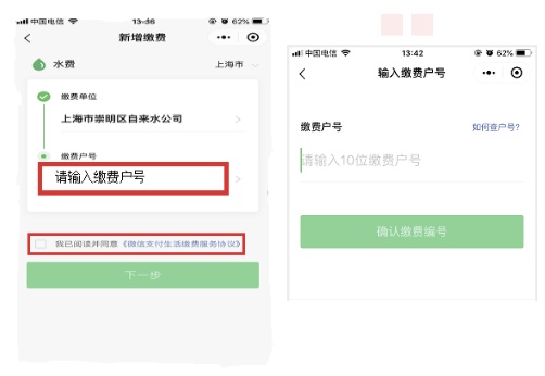 4.输入缴费户号(即水费账单右上方的统册号),并勾选“我已阅读并同意《微信支付生活缴费协议》”