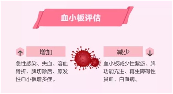 常见的血小板减少原因有:急性感染,免疫性血小板减少性紫癜,脾机能亢进,药物或理化因素,再障,恶性血液系统肿瘤等;增加原因有:急性感染,慢性骨髓增殖性疾病,失血,溶血,脾切术后等。血小板计数减少会引起出血,增多则会增加血栓风险。因此,若有血小板计数的明显异常,包括减少或增加,均要进一步检查原因。