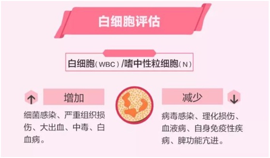 其升高或减少都有一定意义,各项白细胞工作侧重点不同。比如,细菌感染时中性粒细胞升高,病毒感染时淋巴细胞升高白细胞总数可能降低,疟疾,活动性结核时单核细胞升高,寄生虫感染,过敏时嗜酸性细胞升高。除了感染,严重外伤、大出血、中毒、血液系统各种疾病等也会引起白细胞异常改变。还有一些生理性表现,如剧烈运动,环境温度剧变,情绪激动,妊娠期等也可使白细胞升高,这些需要病史详细鉴别。