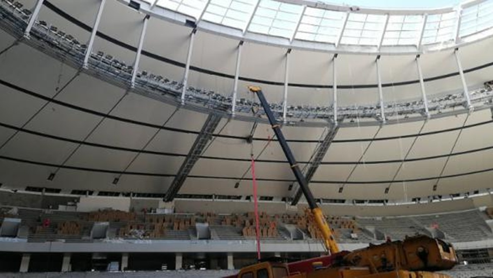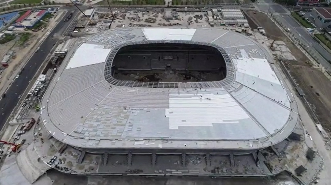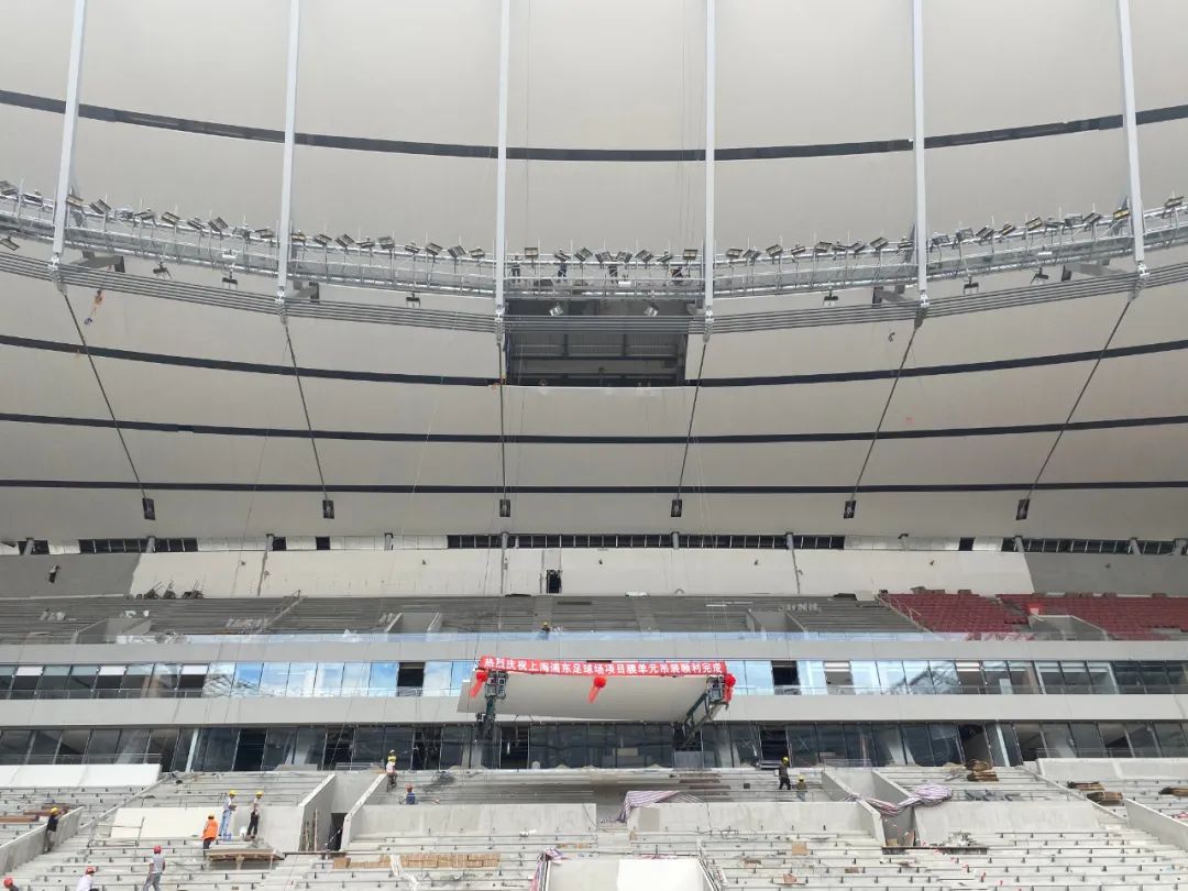 历时两个多月,浦东足球场276个膜单元吊装工作整体完成,膜面积约3万平米。膜结构是由多种高强薄膜材料及加强构件(钢架或钢索)通过一定方式使其内部产生一定的预张应力以形成某种空间形状,作为覆盖结构。上海浦东足球场采用膜单元仰面吊装设计,相邻的膜单元与膜单元间无缝对接,这样的设计在全世界尚属首例。