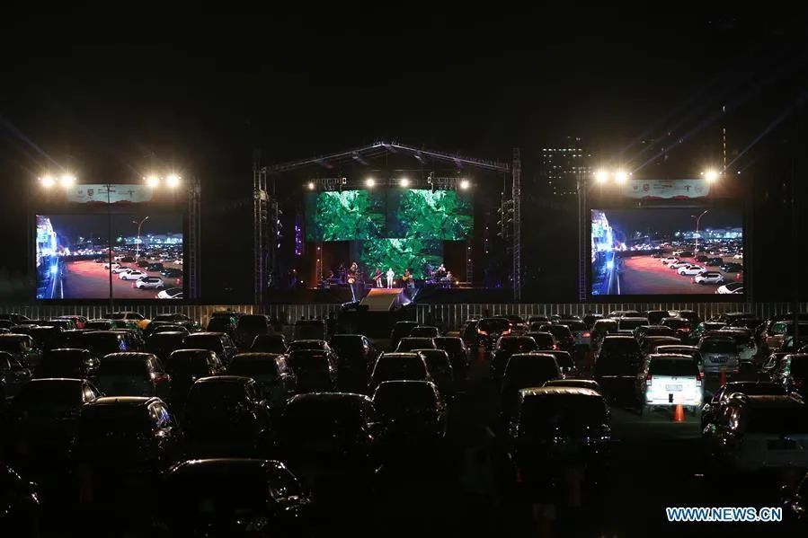 8月29日晚间,印度尼西亚首都雅加达举办了一场别开生面的“汽车音乐会”。观众可以直接开车进场观看演出,并在入场前接受体温检测。该场演出吸引近千人观看,演出结束时,观众通过“按喇叭”“闪车灯”代替鼓掌。
