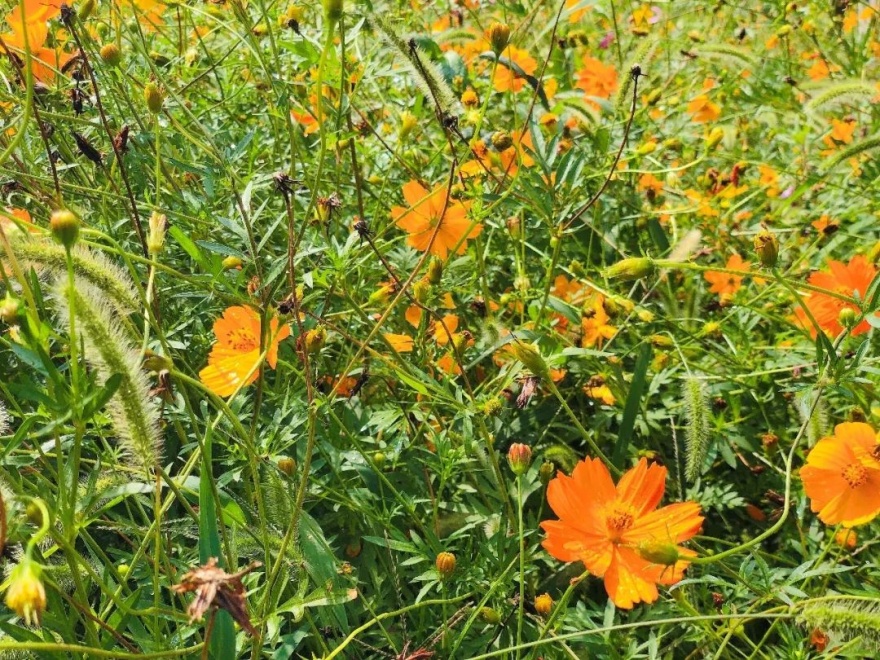 硫华菊的死敌是风,大风会让它倒伏。因为它是草本植物,枝茎瘦弱,根系不发达,“个子”又比较高,大风一吹,就站不稳了。